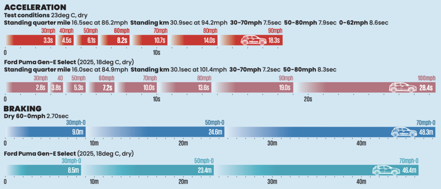 If there is a slight blot in the 4’s copybook, it concerns emergency stops. Even on a warm day, the ABS intervention was rudimentary, although the outright stopping distance was similar overall to that of the Puma Gen-E. (Incidentally, both cars are shod with Goodyear EfficientGrip Performance 2 rubber.) When we tested it, the 5 did better, even in much cooler conditions. Perhaps the difference was down to its Continental tyres.