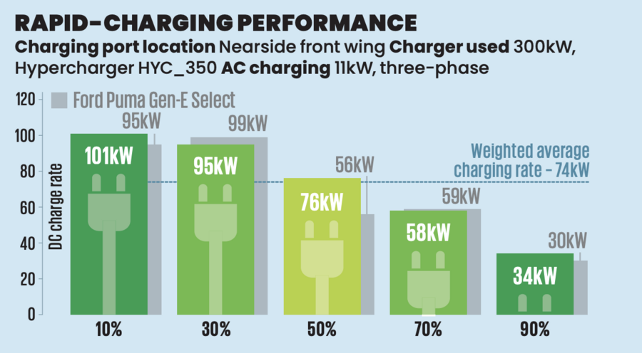 In terms of efficiency, the 4 did a little better than the 5 in all types of driving, though this is almost certainly down to the much warmer, more favourable weather on the day of its test at Horiba MIRA. Its everyday economy figure (a test that comprises a blend of speeds in the 20-50mph range, and a steady driving style) of 5.6mpkWh translates to a range of 291 miles, which is stellar, though not quite as stellar as the Puma Gen-E’s figure of 6.2mpkWh.